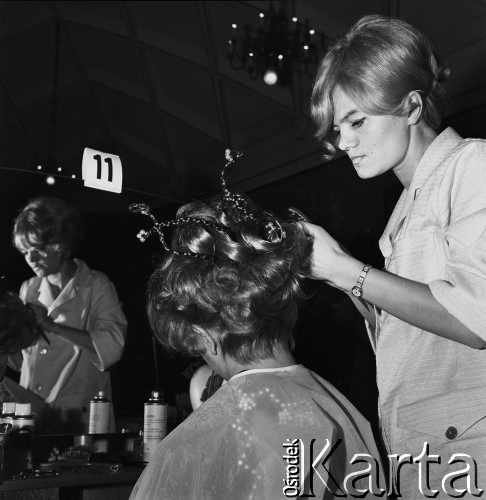 Stołeczny konkurs fryzjerski spółdzielczości pracy, fryzjerka układająca włosy modelce.