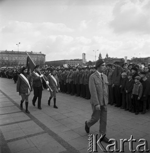 Plac Zwycięstwa (obecnie Piłsudskiego). Uroczyste nadanie imienia "Synów Pułków" szczepom ZHP. Przemarsz harcerzy z chorągwią.