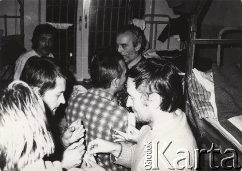 Działacze opozycji i "Solidarności" zatrzymani w nocy z 12 na 13 grudnia 1981 r. i osadzeni w ośrodku internowania w Białołęce. Siedzą przy stole: Wojciech Bogaczyk, za nim Jarosław Guzy.