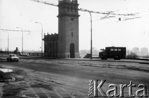 Stan wojenny - ruch uliczny na Moście Poniatowskiego w pierwszych miesiącach stanu wojenngo. Na chodniku widoczne zapory przeciwczołgowe oraz samochód milicyjny.