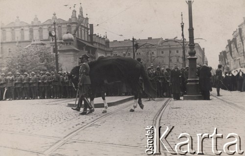 Pogrzeb Marszałka Józefa Piłsudskiego, uroczystości na Rynku Starego Miasta, Kasztanka przykryta kirem.