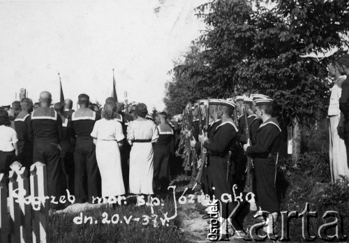 Pogrzeb marynarza Floty Pińskiej Jóźwiaka, za marynarzami z krzyżem i sztandarami idzie orkiestra floty.