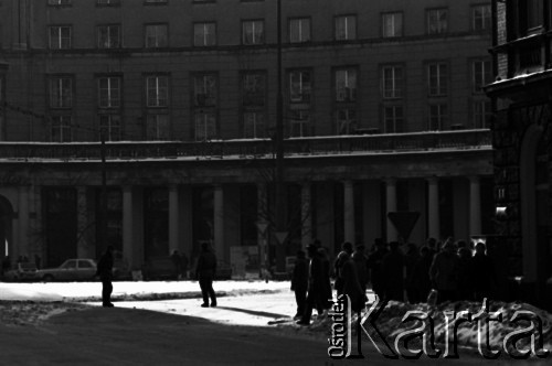 Wprowadzenie stanu wojennego - widok ulicy Mokotowskiej przed siedzibą Zarządu Regionu Mazowsze NSZZ "Solidarność". Widoczny samochód Milicji Obywatelskiej (tzw. "suka") oraz osoby obserwujące interwencję Milicji Obywatelskiej w siedzibie Regionu Mazowsze.