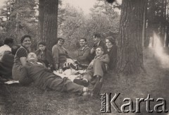 1958, Druskienniki, Litewska SRR, ZSRR. Wczasowicze w lesie, w środku siedzi Wanda ...