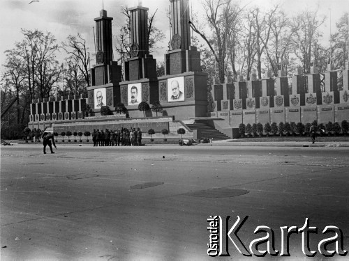 Grupa oficerów radzieckich stoi przed trybuną honorową w czasie przygotowań do defilady zwycięstwa.