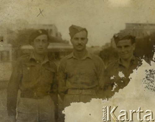 Dwaj junacy, z lewej stoi Eugeniusz Skowalczyński (uczestnik walk pod Monte Cassino). W środku siedzi mężczyzna w garniturze, trzymający w dłoni filiżankę.