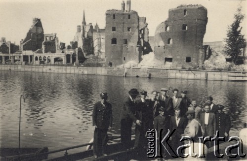 Pracownicy warszawskich kolei na wycieczce w Gdańsku, przeprawa promem przez Motławą, w tle zniszczony Żuraw Gdański.