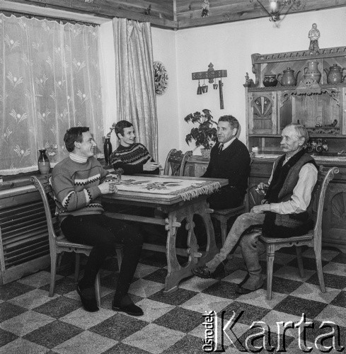 Rodzina Bachledów-Curusiów przy kominku. 2. od prawej śpiewak operowy Andrzej Bachleda-Curuś, dalej jego dwaj synowie - Andrzej i Jan - narciarze alpejscy.