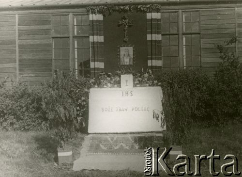 Uroczystości Bożego Ciała na terenie osiedla polskiego. Podpis pod ołtarzem: "Boże zbaw Polskę".