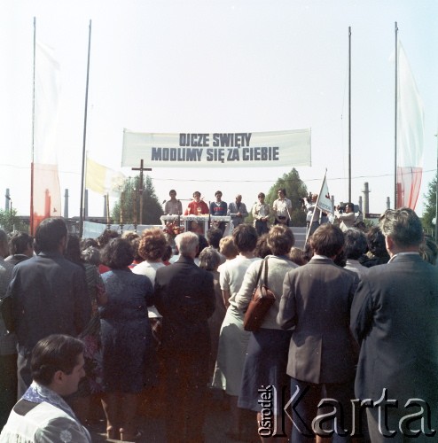 Ksiądz Jerzy Popiełuszko odprawia Mszę świętą przed bramą Huty Warszawa. Msza sprawowana jest w intencji powrotu do zdrowia Jana Pawła II po zamachu w Watykanie 13.05.1981. Nad ołtarzem widoczny jest transparent: "Ojcze Święty modlimy się za Ciebie".