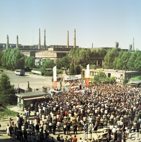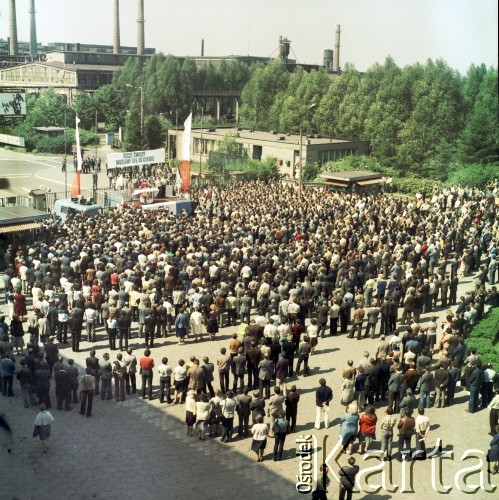 Ksiądz Jerzy Popiełuszko odprawia Mszę świętą przed bramą Huty Warszawa. Msza sprawowana jest w intencji powrotu do zdrowia Jana Pawła II po zamachu w Watykanie 13.05.1981. Nad ołtarzem widoczny jest transparent: "Ojcze Święty modlimy się za Ciebie".