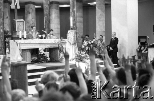 Pogrzeb księdza Jerzego Popiełuszki w Kościele św. Stanisława Kostki na warszawskim Żoliborzu. Tłum wiernych z uniesionymi do góry dłońmi złożonymi w znak zwycięstwa.