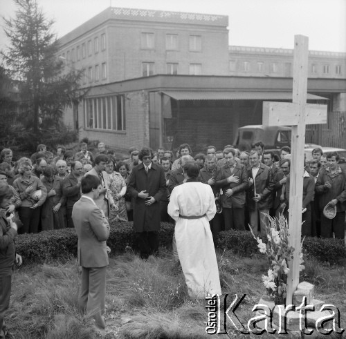 Wkopanie Krzyża na terenie Huty Warszawa po mszy odprawionej w pierwszą rocznicę zakończenia strajku pracownikow Huty Warszawa oraz podpisania porozumień sierpniowych 31.08.1980 w Gdańsku. Obok Krzyża stoi (tyłem) ksiądz Jerzy Popiełuszko. W pierwszym rzędzie widoczny jest Seweryn Jaworski, Karol Szadurski i Jacek Lipiński.