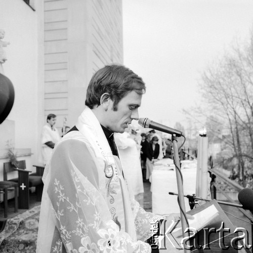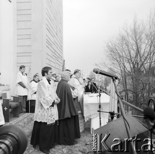 Uroczystość poświęcenia sztandaru NSZZ "Solidarność" Huty Warszawa w Kościele św. Stanisława Kostki na warszawskim Żoliborzu. Na pierwszym planie widoczny jest ksiądz Jerzy Popiełuszko. Od lewej strony stoją: NN, ksiądz prałat Teofil Bogucki, biskup Zbigniew Kraszewski, sufragan warszawski oraz reprezentacja hutników trzymająca sztandar.