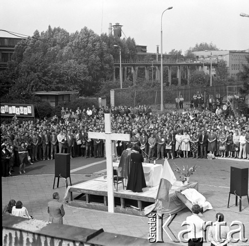 Msza święta podczas strajku w Hucie Warszawa. Widok z góry na wiernych uczesniczących we mszy. W oddali widoczne są budynki huty.