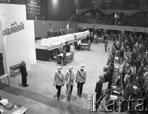 Wiec hutnikow Huty Warszawa przy sali Centralnego Laboratorium, zwołany na wieść o wprowadzeniu w Polsce stanu wojennego. Na wiecu postanowiono ogłosić strajk okupacyjny.