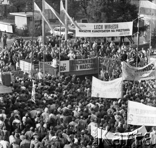 Wizyta Lecha Wałęsy w Hucie Warszawa. Na transparencie widoczny jest fragment napisu: "Lech Wałęsa. Naszym kandydatem na Prezydenta". Po prawej stronie stoi Jacek Lipiński.
