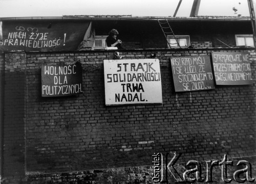 Strajk w Stoczni Gdańskiej im. Lenina, hasła na murze: "Niech żyje MKS", "My z ludem, lud z nami, my stoczniowcy się nie damy".