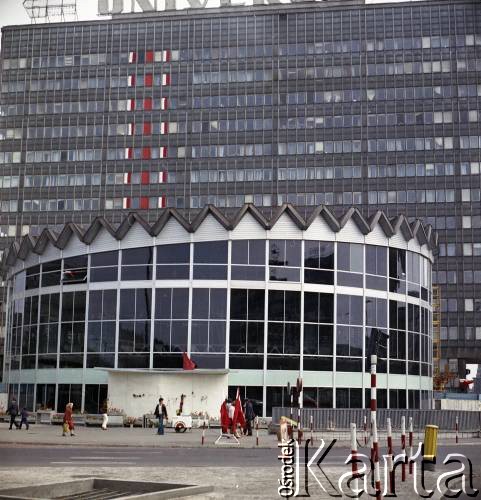 Obchody 35-lecia PRL. Plakat propagandowy w tle Pałac Kultury i Nauki.