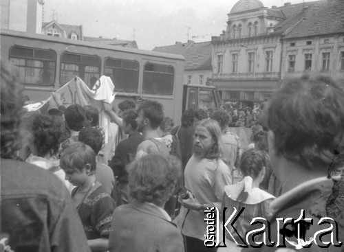 Festiwal Muzyki Rockowej Jarocin '88, n/z grupa muzyczna przed kościółem św. Marcina.
