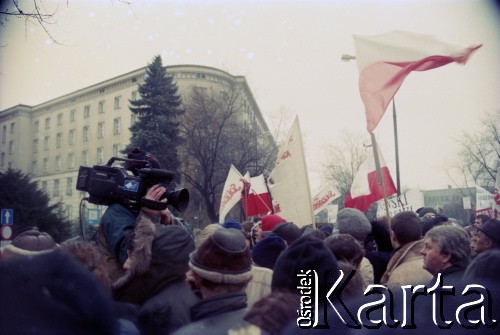 Manifestacja pod Sejmem przeciwko prezydenturze Aleksandra Kwaśniewskiego, n/z transparent "Powstrzymajmy komunę KPN".