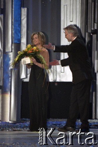 Gala Nagród Akademii Telewizyjnej Wiktory 2002 w Teatrze Wielkim, n/z od lewej: Maciej Stuhr, Magda Mołek, Ewa Drzyzga.