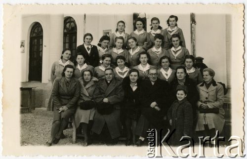 Uczennice klasy III a polskiego gimnazjum w dniu przyrzeczenia i przyjęcia do Sodalicji Mariańskiej. W pierwszym rzędzie (od lewej): kierownik internatu p.Ustrzycka, dyrektorka gimnazjum p. Maria Krzyżanowska, ksiądz Franciszek Tomasik, wychowawczyni p. Kulikowska, inspektor p. Lorenowicz, opiekunka klasy p. Przeździecka, p. profesor Niedenthalowa.
