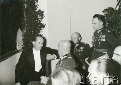 Rozmowa Jana Kiepury z marszałkiem Edwardem Rydzem-Śmigłym w loży Teatru "Roma" po koncercie śpiewaka na rzecz Funduszu Obrony Narodowej. Za marszałkiem siedzi generał Aleksander Litwinowicz, obok stoi pułkownik Tadeusz Münnich.