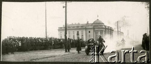 Żołnierze 4 Batalionu Pancernego Wojska Polskiego (do 1935 r. 4 Dywizjonu Pancernego) podczas defilady. Na pierwszym planie widoczny żołnierz jadący motorem CWS M111 - Sokół 1000. W głębi neoklasyczny gmach Banku Narodowego.