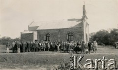 Brak daty, Pampa Juanita, prowincja Chaco, Argentyna. Polskie rodziny przy wybudowanym przez siebie kościele pw. Matki Boskiej Częstochowskiej. Fot. NN / Ośrodek KARTA