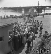 Lipiec 1957, Warszawa. Warszawiacy na przystani nad Wisłą - kolejka do kasy dworca wodnego, ...