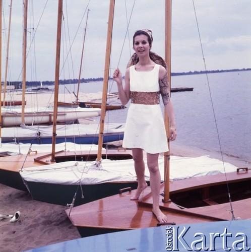Pokaz mody letniej z kolekcji Mody Polskiej, modelka i żaglówki na brzegu Zalewu Zegrzyńskiego.