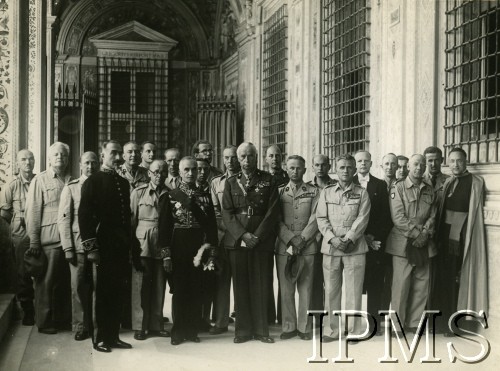 Delegacja przedstawicieli Wojska Polskiego na audencji u papieża Piusa XII. Od lewej” redaktor „Gońca Karpackiego” plutonowy Władysław Choma, Melchior Wańkowicz, Brzezina, szambelan Farelli, pułkownik Ludwig, porucznik Pawłowski, pułkownik Sulisławski (?), generał Franciszek Kleeberg, ambasador przy Stolicy Apostolskiej Kazimierz Papée, pułkownik Franciszek Demel, porucznik Ludwik Łubieński, pułkownik Klemens Rudnicki, generał Kazimierz Sosnkowski, major Minke, generał Michał Karaszewicz –Tokarzewski, porucznik Jan Jaxa-Dębicki, generał Bronisław Duch; sekretarz ambasady Bronowski, rotmistrz NN, porucznik Dzięgielewski, pułkownik Kończyc, Tyszko, ksiądz Walerian Meysztowicz.