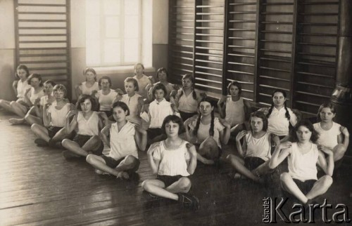 Szkoła powszechna, uczennice podczas lekcji wychowania fizycznego.
