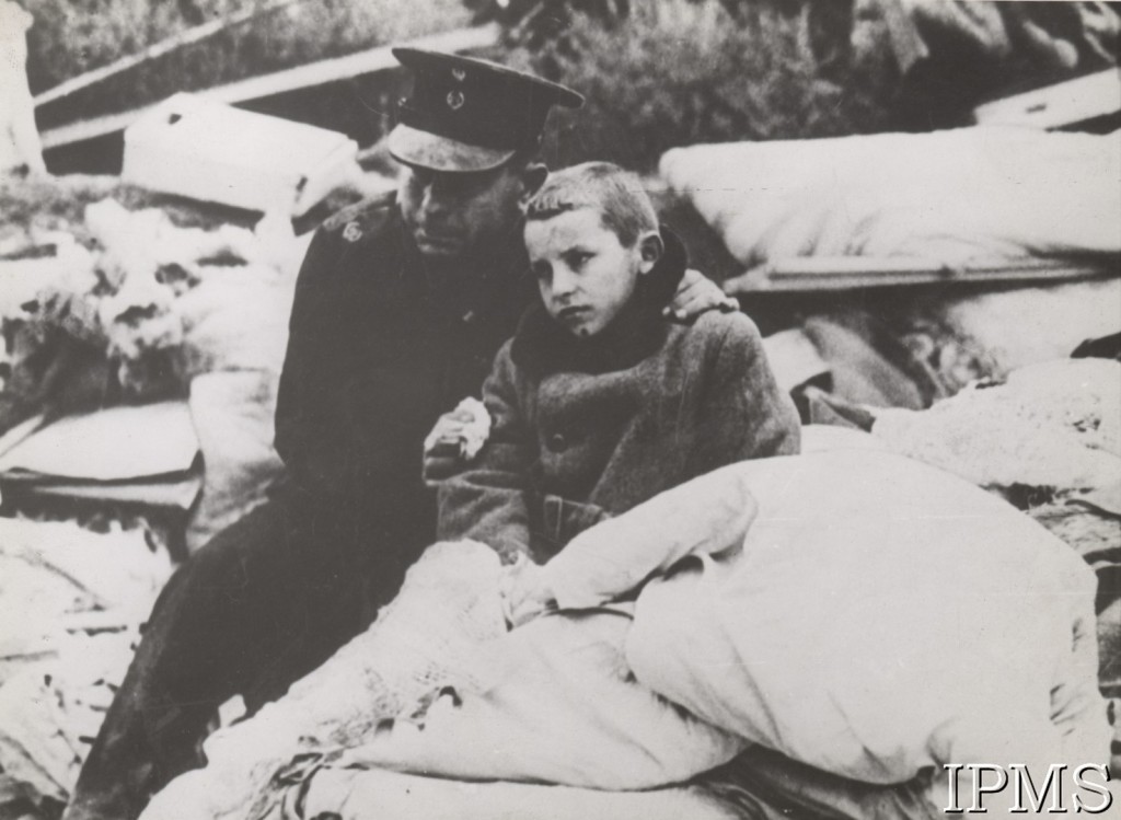 1939, Polska. Mężczyzna w mundurze i chłopiec siedzą na gruzach domu. Fot. NN/IPMS w Londynie