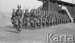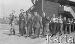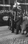 1.05.1983, Wrocław, Polska. Stan wojenny - niezależny pochód pierwszomajowy, zorganizowany przez podziemne struktury "Solidarności", wmieszany w pochód oficjalny, zmierza w stronę trybuny honorowej przygotowanej do powitania pochodu oficjalnego. Fot. NN, zbiory Ośrodka KARTA