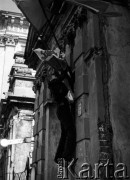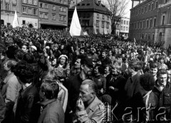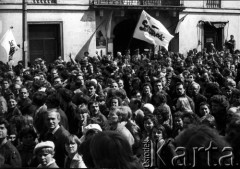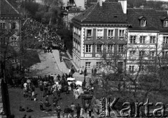 Lata 80., Paryż, Francja Manifestacja Confédération générale du travail (CGT) – najliczniejszego we Francji związku zawodowego – w czasie pochodu pierwszomajowego na Bulwarze Magenta. Polscy działacze "Solidarności" z dachu jednego z budynków rozrzucili ulotki. Fot. Andrzej Mietkowski, zbiory Ośrodka KARTA