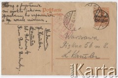 21.11.1917, Szczypiorno k/Kalisza, Polska. Rewers kartki pocztowej wysłanej przez żołnierza 1 Pułku Ułanów Legionów Polskich Juliusza Kamlera (1898-1919) ze Szczypiorna do jego rodziców Juliusza Leopolda i Amelii Kamlerów zamieszkałych w Warszawie przy ulicy Pięknej. Juliusz Kamler w lipcu 1917 roku został internowany w obozie dla legionistów w Szczypiornie. Kartka do rodziców została wysłana tuż po kilkudniowej głodówce legionistów podjętej na znak protestu przeciwko rozkazowi naszycia na ich mundury numerów obozowych. Na kartce widoczne dwa stemple pocztowe - polski i niemiecki. Fot. zbiory Ośrodka KARTA, Pogotowie Archiwalne [PAF_004], udostępniła Anna Stańczykowska