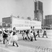 22.07.1974, Warszawa, Polska. 30. rocznica powstania Polskiej Rzeczpospolitej Ludowej. W pochodzie na Placu Defilad bierze udział delegacja z ludowego zespołu pieśni i tańca prawdopodobnie z Podhala. W głębi widoczny transparent ustawiony przed Domem Towarowym Wars, Sawa i Junior. Fot. Edward Grochowicz, zbiory Ośrodka KARTA