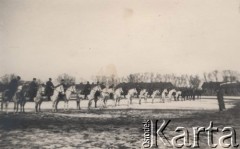 1918-1939, Augustów, Polska. I Pułk Ułanów Krechowieckich. Załadunek przodków — jaszczów artyleryjskich. Przy wagonach oficerowie i szeregowi z I Pułku Ułanów Krechowieckich, orkiestra pułkowa. Fot. Instytut Polski i Muzeum im. gen. Sikorskiego w Londynie
