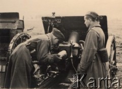 Maj 1944, Cassino, Włochy. Bitwa pod Monte Cassino, dwaj żołnierze 2 Korpusu, stojący obok moździerza na stanowisku artyleryjskim, osłoniętym workami z piaskiem. Fot. T. Szumański, Instytut Polski im. Gen. Sikorskiego w Londynie [album negatywowy nr 105]