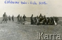 Lato 1938, Czerwony Bór, woj. białostockie, Polska. Mazowiecka Szkoła Podchorążych Rezerwy Artylerii im. gen. Józefa Bema, ćwiczenia na poligonie, bateria na stanowisku. Fot. NN, zbiory Ośrodka KARTA, Pogotowie Archiwalne [PAF_012] , udostępnił Michał Zdrojewski