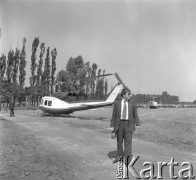 29.07.1975, Oświęcim-Brzezinka, Polska. Wizyta prezydenta Stanów Zjednoczonych Geralda Forda w obozie koncentracyjnym Auschwitz-Birkenau. Ochroniarze pilnujący prezydenckiego śmigłowca. Fot. Kazimierz Seko, zbiory Ośrodka KARTA