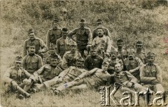 1917, brak miejsca, zabór austriacki. Portret grupowy żołnierzy – rekonwalescentów z wojska austro-węgierskiego – najprawdopodobniej w szpitalu. Na odwrocie list od Jana Dula (?) do przyjaciela - Ludwika Baraniuka. Data na znaczku pocztowym: 26.03.1917. Fot. NN, zbiory Archiwum Historii Mówionej Ośrodka KARTA i Domu Spotkań z Historią, udostępnił Stanisław Baraniuk w ramach projektu "KARTA z Polakami na Wschodzie" (sygnatura nagrania - AHM_PnW_2494).