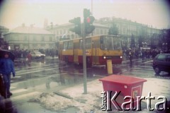 Listopad 1986, Warszawa, Polska. Układanie torowiska tramwajowego w Alejach Jerozolimskich, w tle wieżyczki mostu Poniatowskiego i autobus 125. Fot. Jarosław Tarań, zbiory Ośrodka KARTA [86-41]