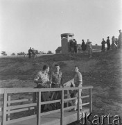 Lipiec 1957, Warszawa, Polska. Warszawacy na plaży nad Wisłą, przy brzegu cumuje barka. Fot. Romuald Broniarek, zbiory Ośrodka KARTA