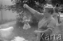 lata 50-te, Warszawa, Polska. Bazar Różyckiego. Kobieta sprzedająca lalki. Fot. Irena Jarosińska, zbiory Ośrodka KARTA.