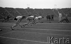 Maj 1959, Warszawa, Polska. Mecz Lekkoatletyczny Polska - Związek Radziecki na Stadionie Dziesięciolecia, zawodnicy podczas biegu. Fot. Romuald Broniarek/KARTA