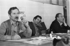 Wrzesień lub październik 1981, Gdańsk, Polska.. Konferencja prasowa BIPS (Biuro Informacji Prasowej Solidarność) podczas I Krajowego Zjazdu Delegatów NSZZ „Solidarność”. Na zdjęciu m.in. Jan Rulewski. Fot. NN, zbiory Ośrodka KARTA, udostępnił Krzysztof Frydrych.