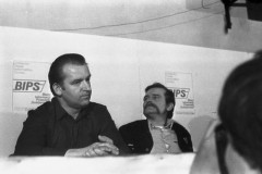 Wrzesień lub październik 1981, Gdańsk, Polska.. Konferencja prasowa BIPS (Biuro Informacji Prasowej Solidarność) podczas I Krajowego Zjazdu Delegatów NSZZ „Solidarność”. Na zdjęciu Zbigniew Bujak i Seweryn Jaworski. Fot. NN, zbiory Ośrodka KARTA, udostępnił Krzysztof Frydrych.